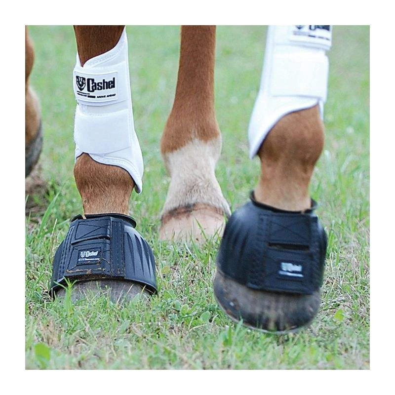 Strong pliant rubber construction provides protection against over reaching and forging. Will not attract stickers or trap burs and grass. Provides 360 degree wrap, covering the entire coronet band and bulb of the hoof. Cashel Rubber Bell Boots have a sturdy leather hook and loop closures for easy application.