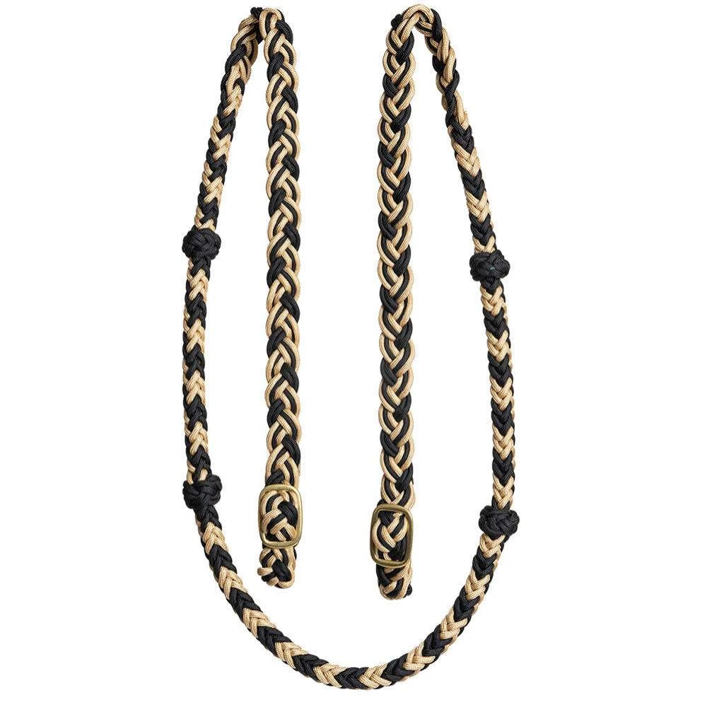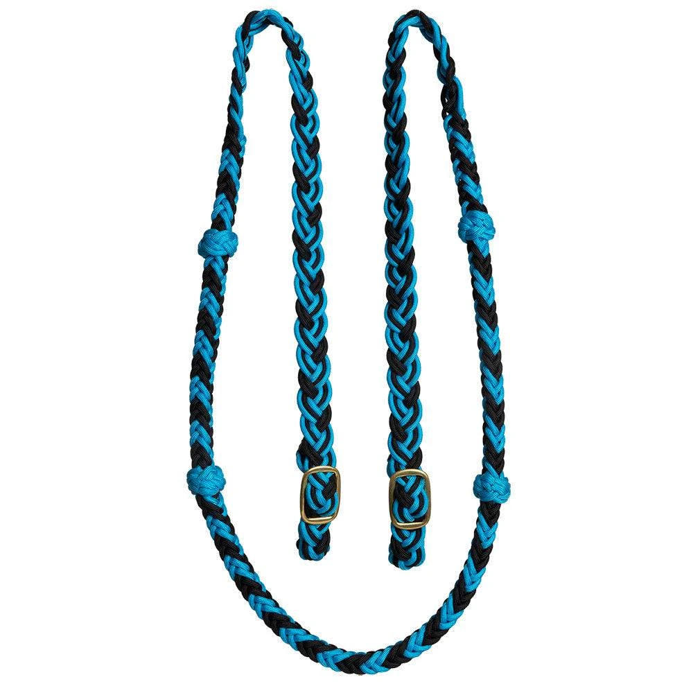 3/4″ x 7′ round braided nylon rein with four easy grip knots and solid brass Conway buckles on each end. Rein features heavy gauge steel wire core inside handle. The steel wire reduces the amount of slack in the rein and helps to aid in lighter hands. There is no stretch or extra slack to get in the way.
