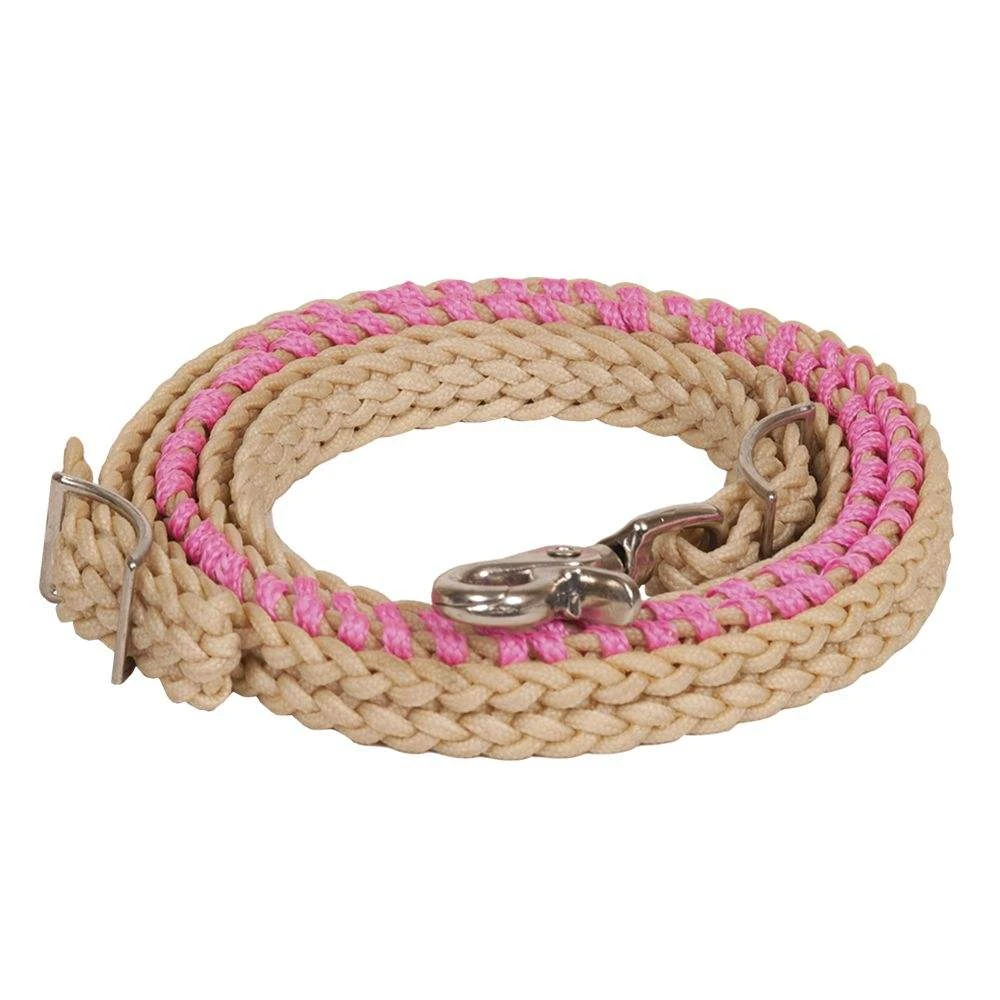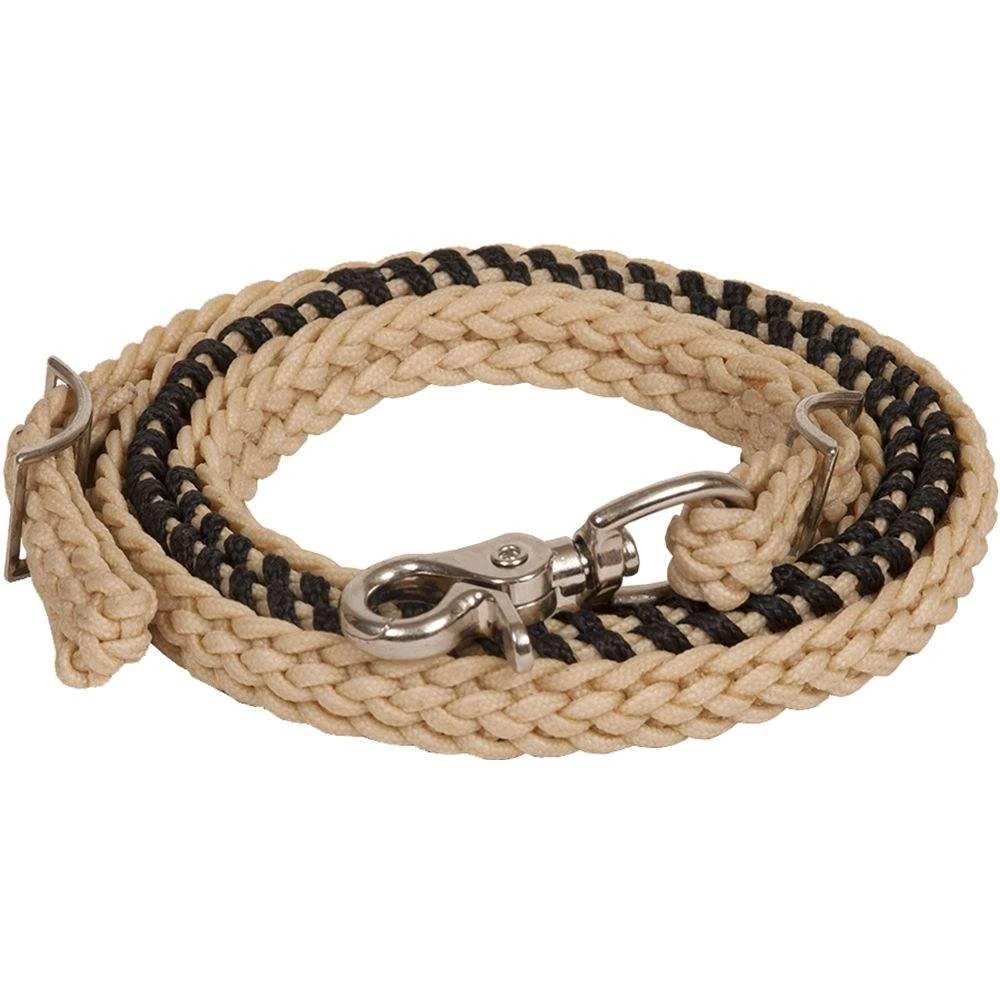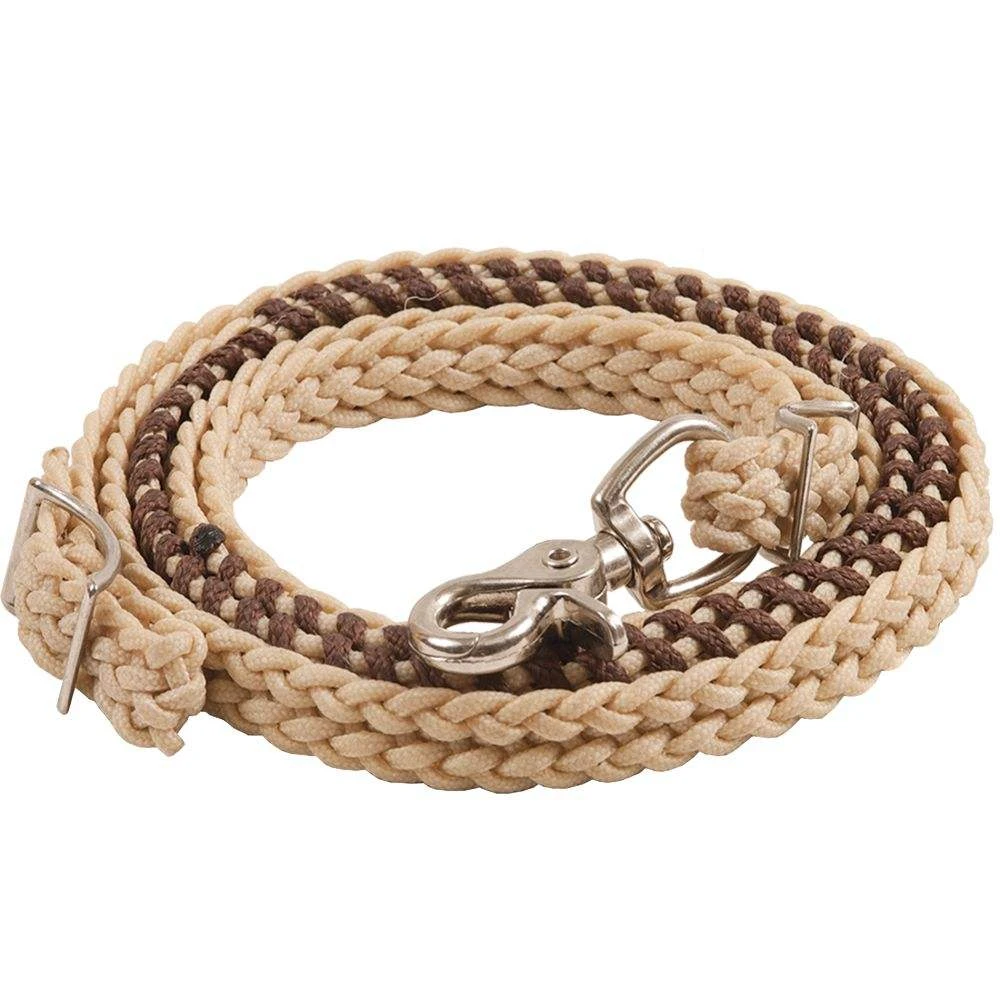Flat braided nylon rein with wax coating and colored laces on the edge for a splash of color. Rein features a nickel plated conway and trigger snap end.