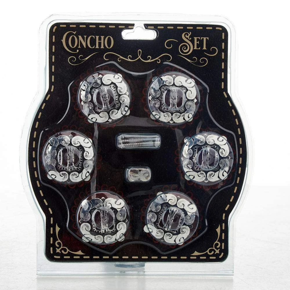 The Silver Swirl Slotted 6pc Saddle Concho Set consists of top-of-the-line metal bases and crafted by some of the best silversmith artists in the world. Each concho design is created to reflect the passion and spirit. The saddle concho set comes standard with 4 1 1/2in and 2 1in conchos. Six Chicago screws and six wood screws are also included for easy and convenient replacement on your headstalls, breast collars, and saddles! AS-C204-SLOT-SET