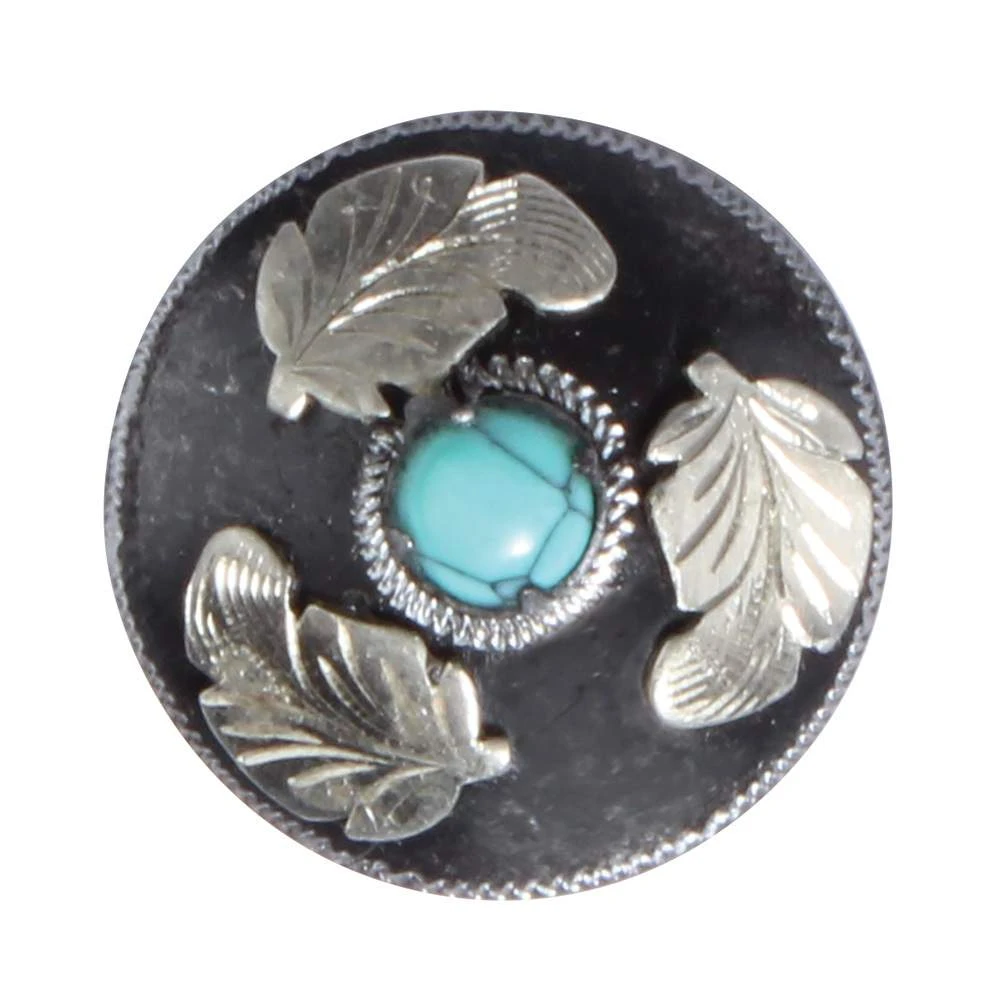 Β This concho from Professional’s Choice features a beautiful feather engraved design with a turquoise stone accent. 1in wide.
