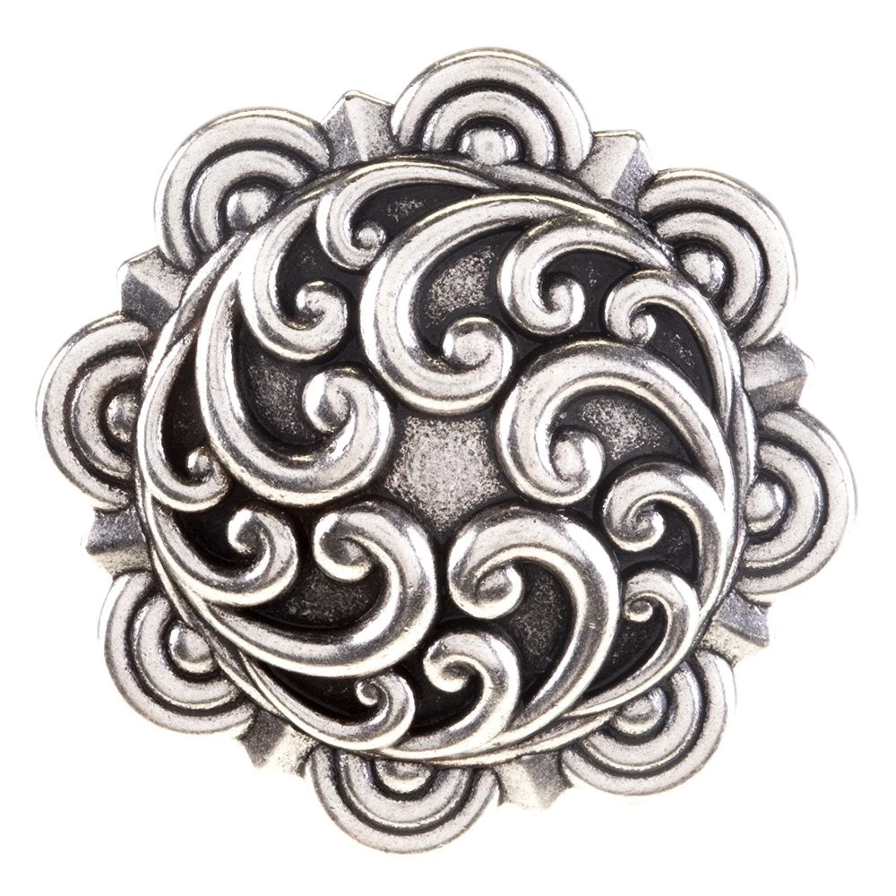 This scalloped scroll concho measures at 1 1/2in long. Offered in a Chicago screw. Great for headstalls, saddles, and leggings!