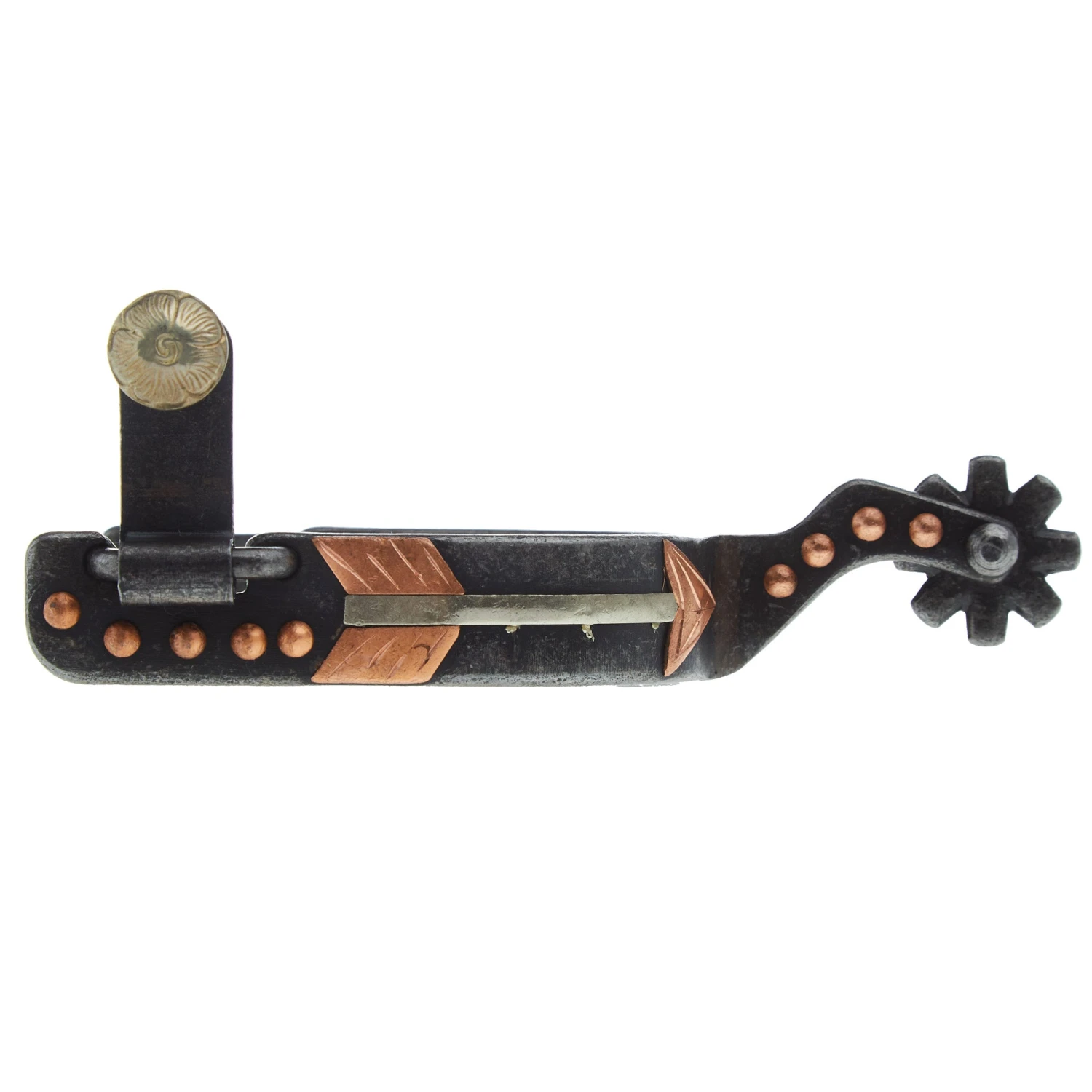 These Weaver ladies spurs are buffed black accented with an arrow design with German silver and copper accents. Features 1-1/2″ shank, 3/4″ band and 8 point rowel.