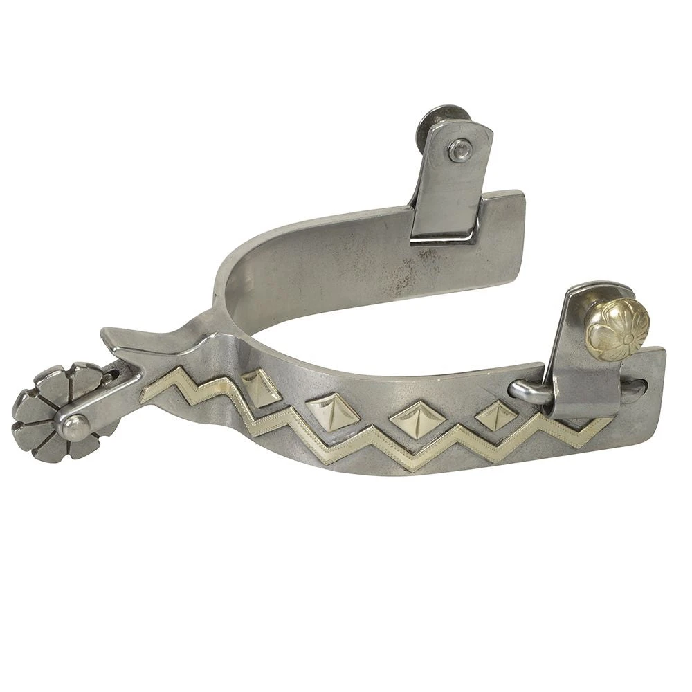 These men’s spur straps feature a 1-1/2″ shank, 1″ band and 10 point replaceable rowel with cotter pins. Sweet iron with German silver trim.