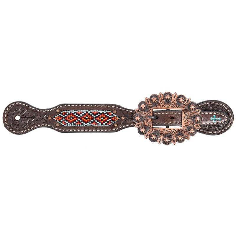 These spur straps are part of Weaver’s new “Tack to Match” program. They are dark chocolate leather tooled in basket weave stamping. They are embossed with turquoise crosses and adorned with intricate beadwork. The have antique copper buckles….show stoppin!!
